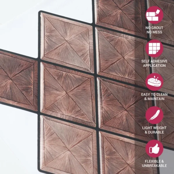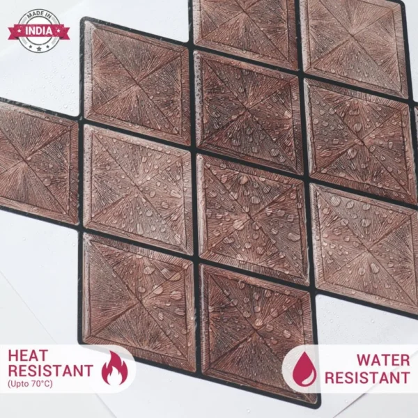 PROPERTIES: Mosaicowall peel & stick tiles exhibit properties like being waterproof, UV resistant, Resistant to heat, Stain-proof, and having a strong adhesive at the back.