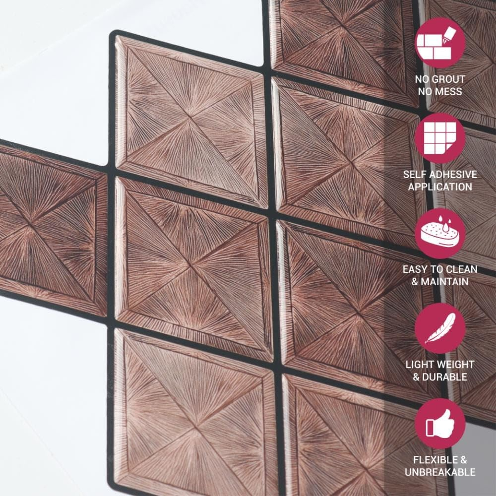 Mosaicowall tiles are made of premium UV-resistant PU coating over a strong self-adhesive base, giving a realistic 3D tile appearance. The PU top layer ensures durability, non-yellowing, and easy cleaning—perfect for Indian kitchens and bathrooms.