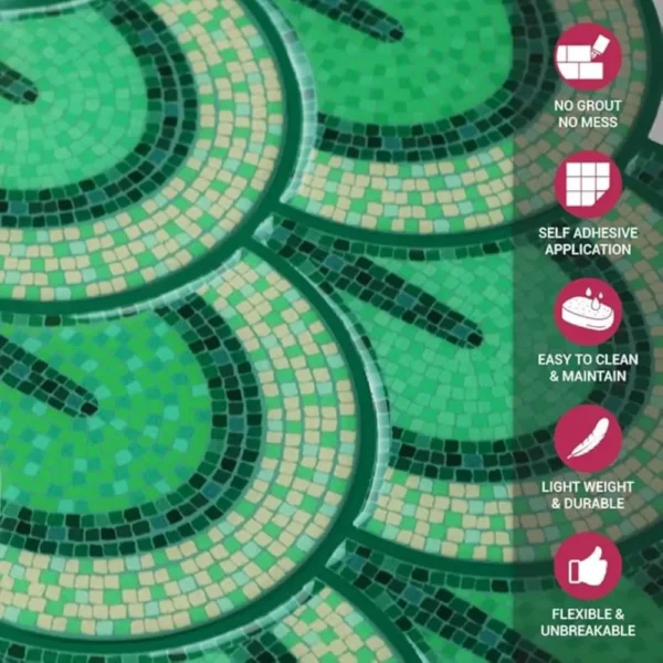 PROPERTIES: Mosaicowall peel & stick tiles exhibit properties like being waterproof, UV resistant, Resistant to heat, Stain-proof, and having a strong adhesive at the back.