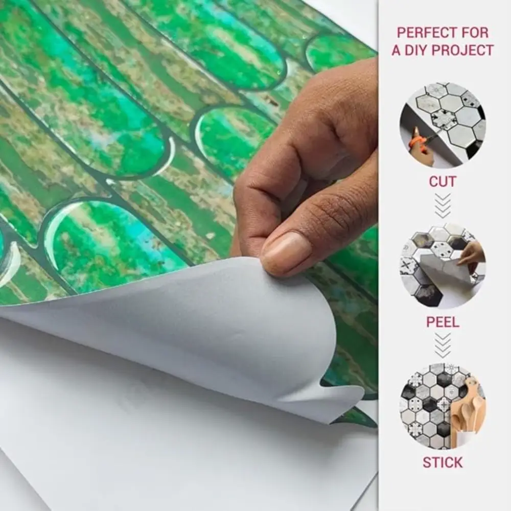 Mosaicowall tiles are made of premium UV-resistant PU coating over a strong self-adhesive base, giving a realistic 3D tile appearance. The PU top layer ensures durability, non-yellowing, and easy cleaning—perfect for Indian kitchens and bathrooms.