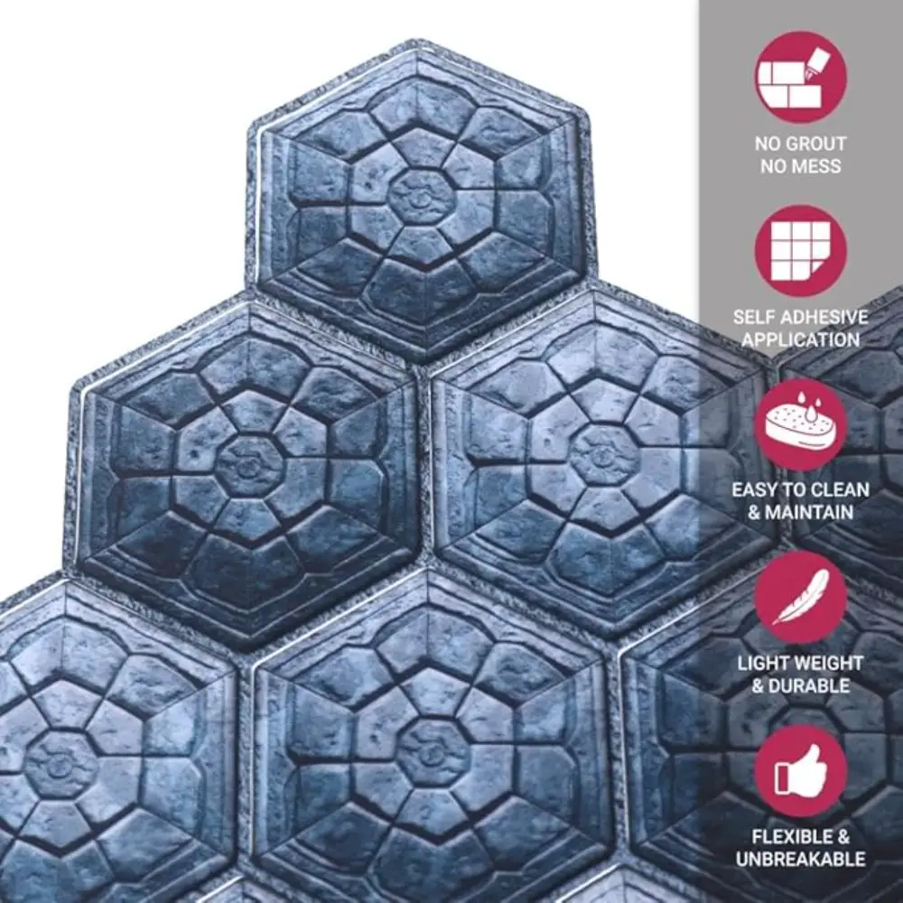 Mosaicowall tiles are made of premium UV-resistant PU coating over a strong self-adhesive base, giving a realistic 3D tile appearance. The PU top layer ensures durability, non-yellowing, and easy cleaning—perfect for Indian kitchens and bathrooms.