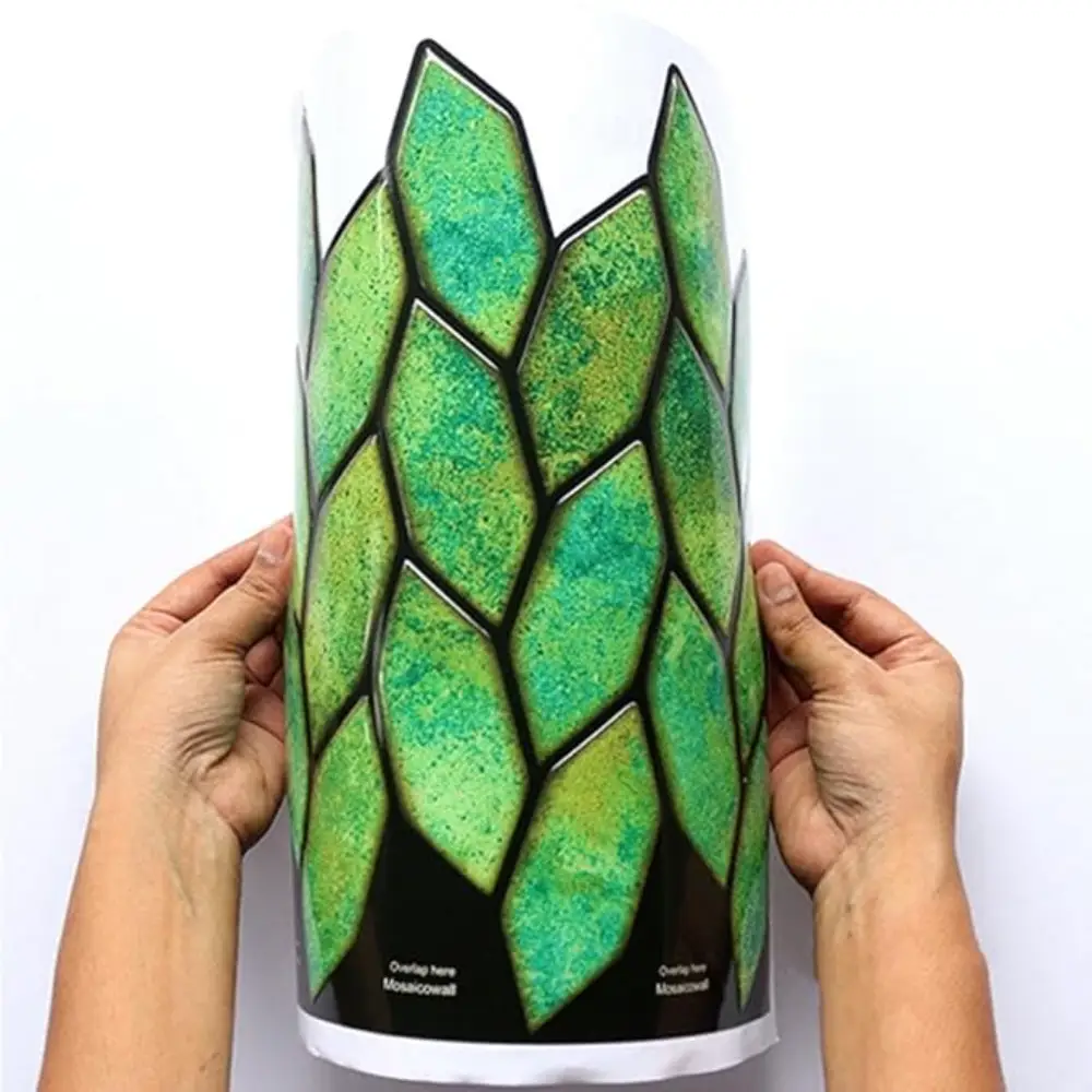 Mosaicowall tiles use a thicker PU coating, stronger adhesive, non-yellowing technology, and premium designs—offering superior quality compared to thin vinyl alternatives.