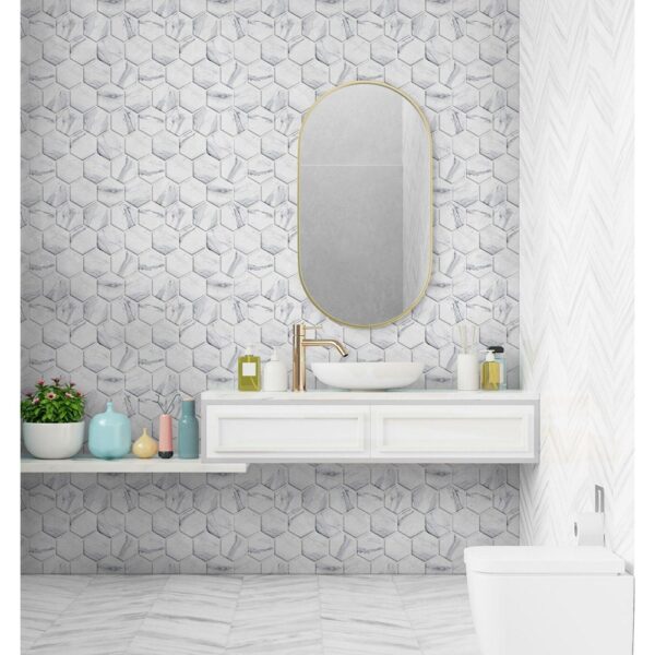 Our Style 04 Classic White Elegance tiles combine timeless Hexagon shapes with contemporary aesthetics for a sophisticated design that seamlessly fuses contemporary with timeless features.