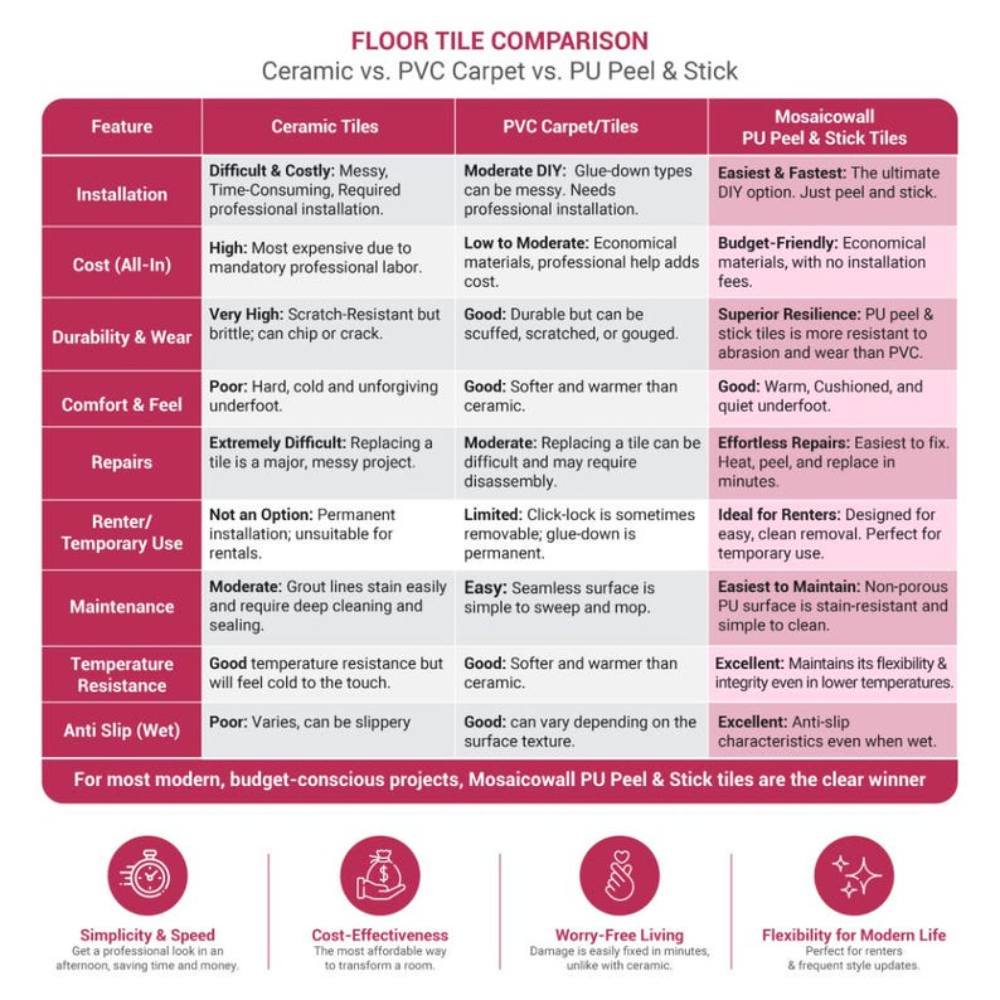 Floor tile stickers are peel-and-stick vinyl or PU tiles designed for quick floor makeovers. They typically last 3–7 years depending on usage and maintenance.