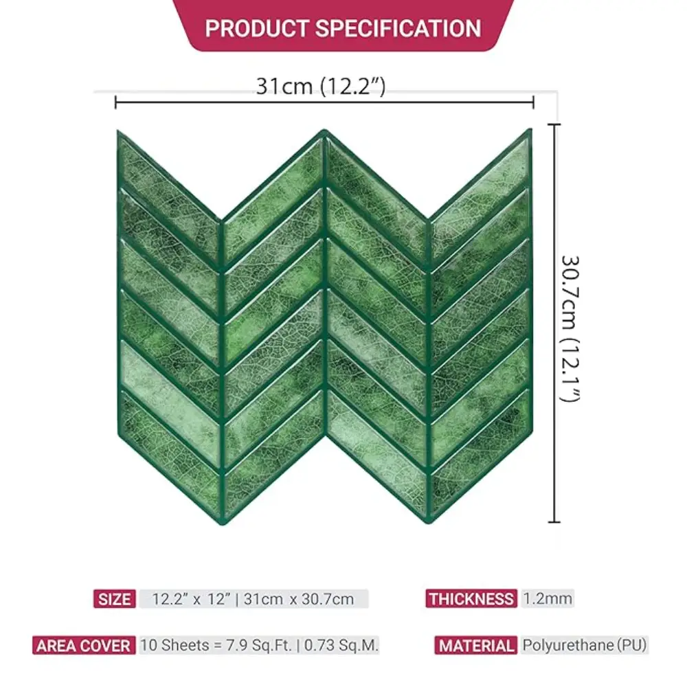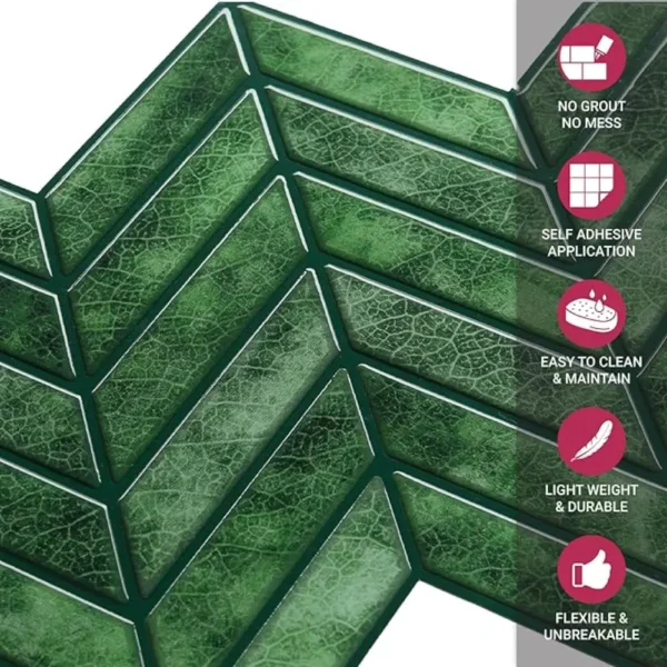 PROPERTIES: Mosaicowall peel & stick tiles exhibit properties like being waterproof, UV resistant, Resistant to heat, Stain-proof, and having a strong adhesive at the back.