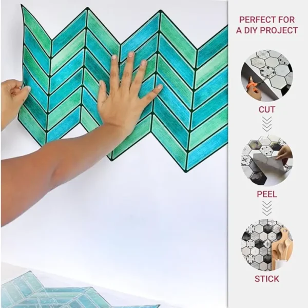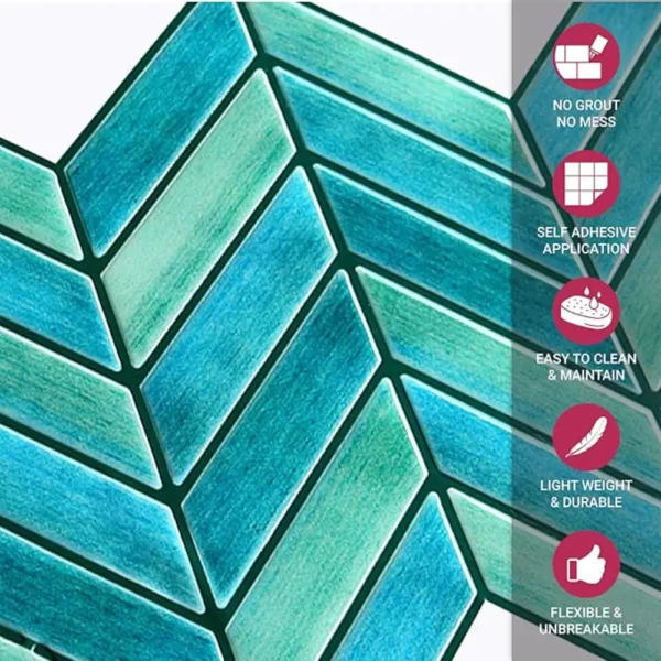 PROPERTIES: Mosaicowall peel & stick tiles exhibit properties like being waterproof, UV resistant, Resistant to heat, Stain-proof, and having a strong adhesive at the back.