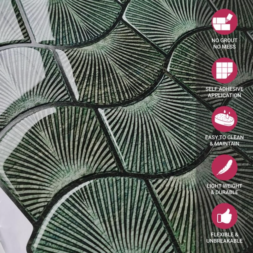 PROPERTIES: Mosaicowall peel & stick tiles exhibit properties like being waterproof, UV resistant, Resistant to heat, Stain-proof, and having a strong adhesive at the back.