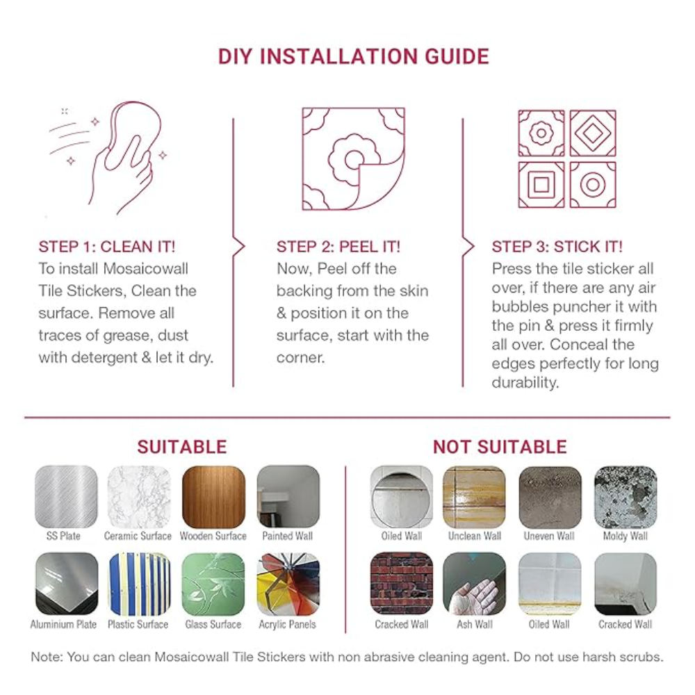 Wall tile stickers adhere best to smooth, sealed, and dry surfaces. Avoid applying on textured, powdery, or damp walls, as this can reduce sticking life and cause edges to lift.